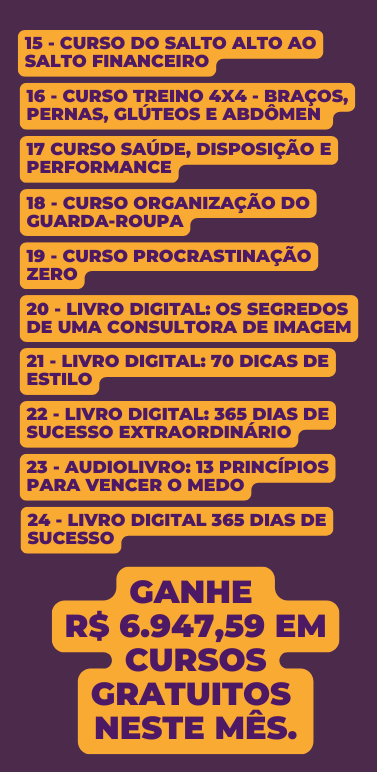 Aprenda a usar o Instagram para construir sua autoridade, conquistar clientes e escalar suas vendas! O único método comprovado para Consultoras de Imagem e Lojistas. 👉 1. Criar posts irresistíveis 👉 2. Conquistar seguidoras engajadas 👉 3. Vender seus serviços com confiança 👉 4. Fechar parcerias lucrativas 👉 5. Falar com segurança na câmera 👉 6. 12 horas de aulas práticas com toda minha experiência. 👉 7. 10 Bônus Grátis 🚀 As vagas são limitadas!