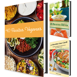 3 e-books - "40 Receitas Veganas" + 2 bônus: "20 Receitas Detox" e "50 Receitas Low Carb"