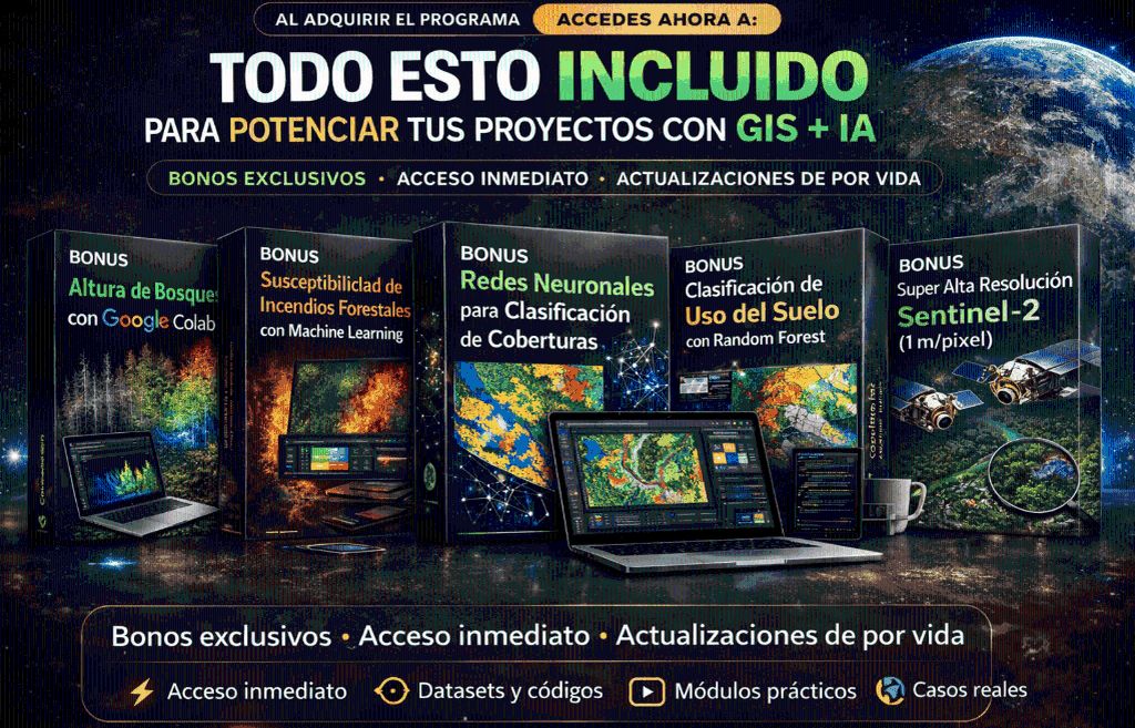 🔍 Descubre cómo aprovechar el poder de la inteligencia artificial generativa para realizar análisis geoespacial en la nube con Google Earth Engine Python y R. Este curso adicional te enseñará paso a paso cómo procesar grandes volúmenes de datos satelitales, crear mapas avanzados y realizar análisis complejos en minutos.