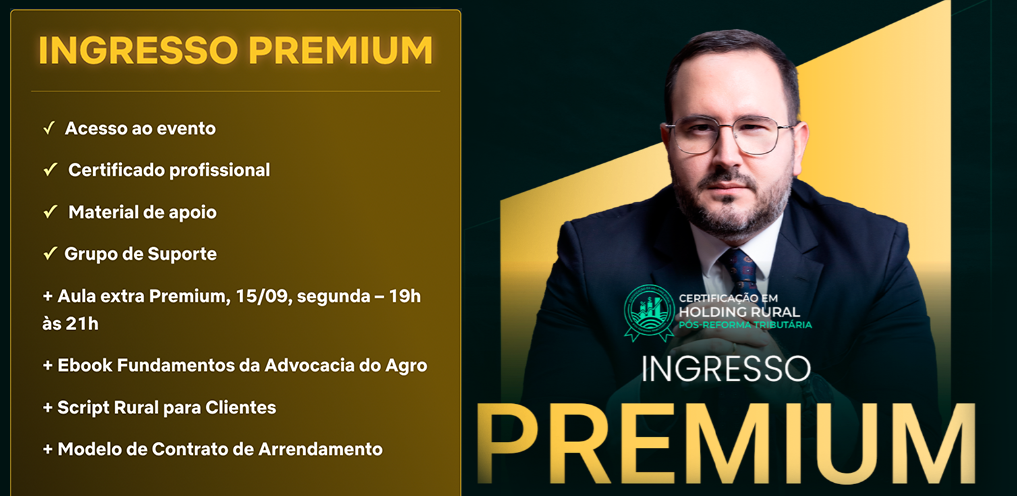 ⚡ GRAVAÇÃO: 3 Dias da Certificação em Holding Rural 📅 Disponível a partir de 22/09 (acesso 12 meses) 🎯 Aprenda no seu ritmo as estratégias pós-Reforma 📚 Revise quantas vezes precisar durante 1 ano ✅ Certificado de conclusão incluso O conhecimento que transforma advogados em especialistas do agro de 6 dígitos