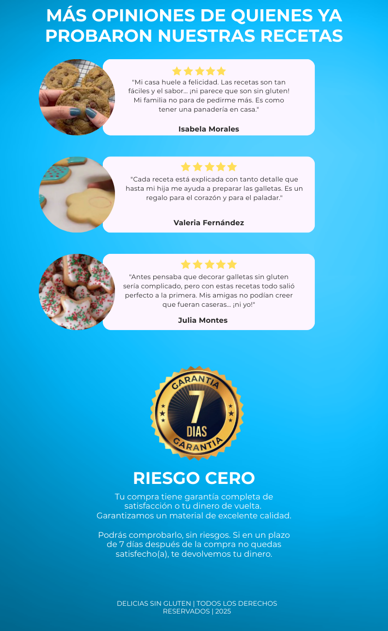 DESCUBRE MÁS SABORES Y SORPRENDE A TODOS Accede a un recetario exclusivo con 30+ recetas inéditas de tortas y postres sin gluten, fáciles de preparar y perfectas para cualquier ocasión especial.