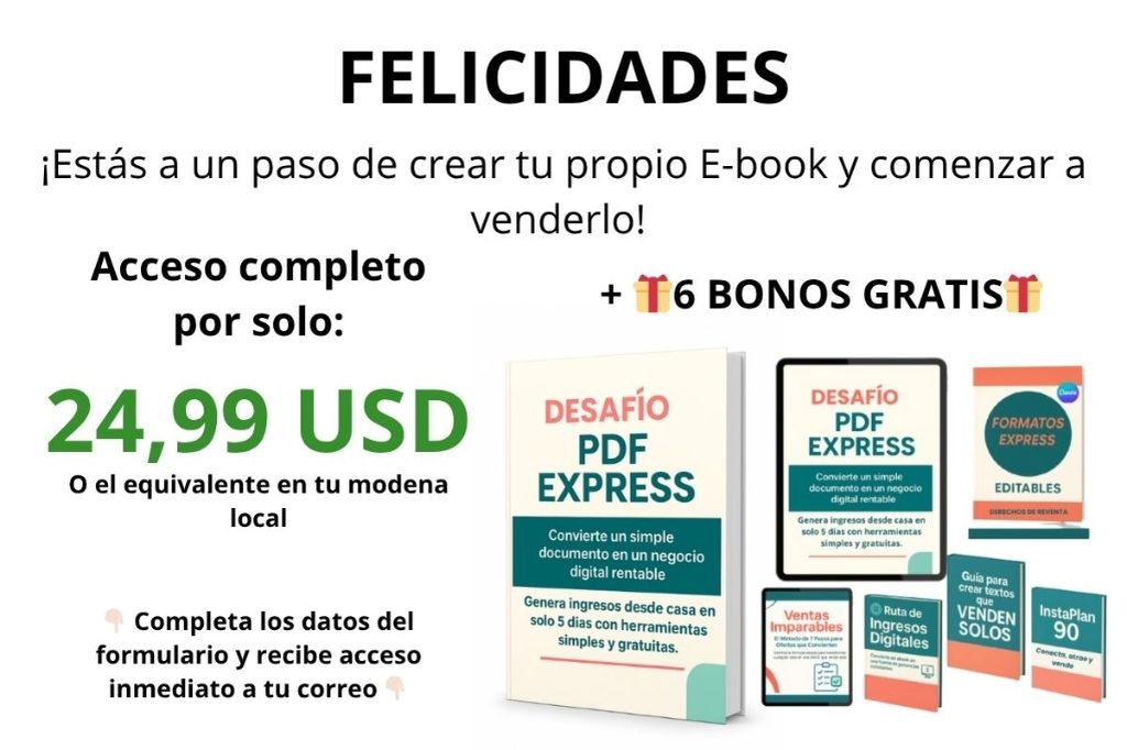 ¿No sabes qué tema elegir para tu primer PDF? 👉 Este pack incluye 45 ideas reales y comprobadas que ya están vendiendo HOY. Solo elige una idea, sigue el método del Desafío PDF Express y lanza tu propio producto rentable en horas. Esta oferta NO la verás en otro lugar-Añádela HOY por solo: