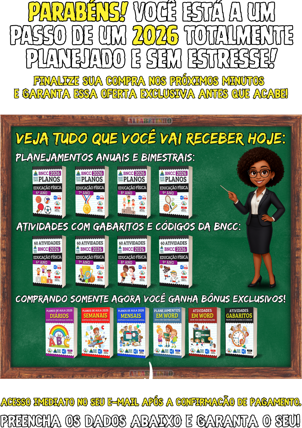 240 Atividades e 210 Planejamentos, todos organizados por Ano e Bimestre, perfeitas para uso imediato. 🎁 GANHE BÔNUS EXCLUSIVOS: 1️⃣ PLANEJAMENTOS EM WORD 2️⃣ ATIVIDADES EM WORD 3️⃣ GABARITOS DAS ATIVIDADES 😱 DESCONTO IMPERDÍVEL, APENAS AGORA!