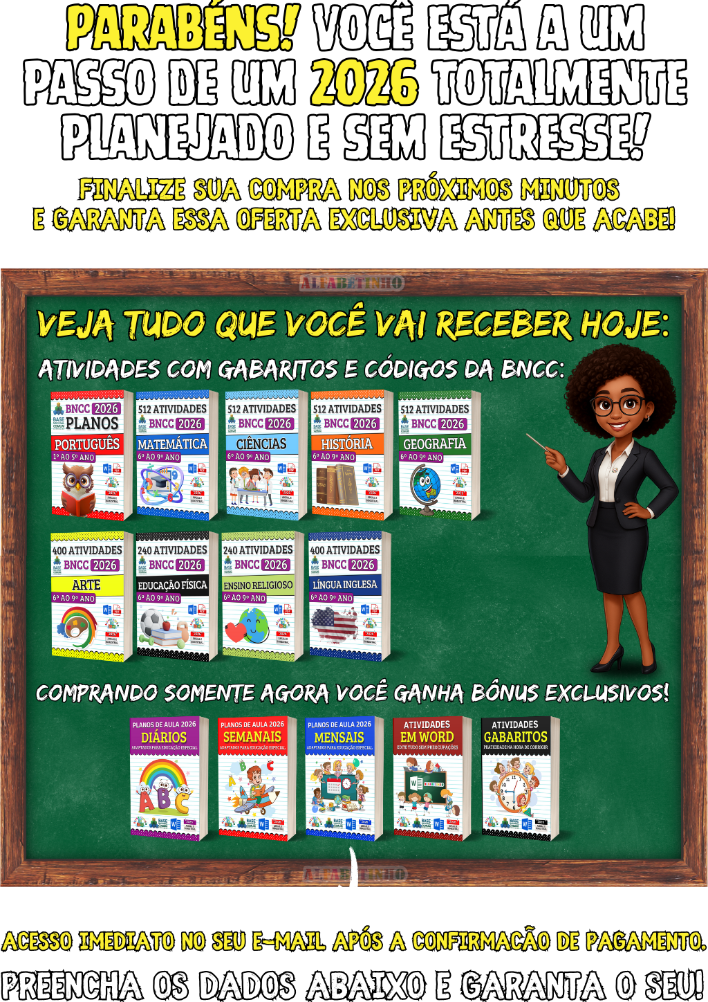2220 Planejamentos, todos organizados por Ano e Bimestre, de acordo com a BNCC 2026. perfeitas para uso imediato. 🎁 GANHE BÔNUS EXCLUSIVOS: 1️⃣ PLANEJAMENTOS EM WORD 2️⃣ 32 PLANOS DIÁRIOS 3️⃣ 24 PLANOS SEMANAIS 4️⃣ 16 PLANOS MENSAIS 😱 DESCONTO IMPERDÍVEL, APENAS AGORA!