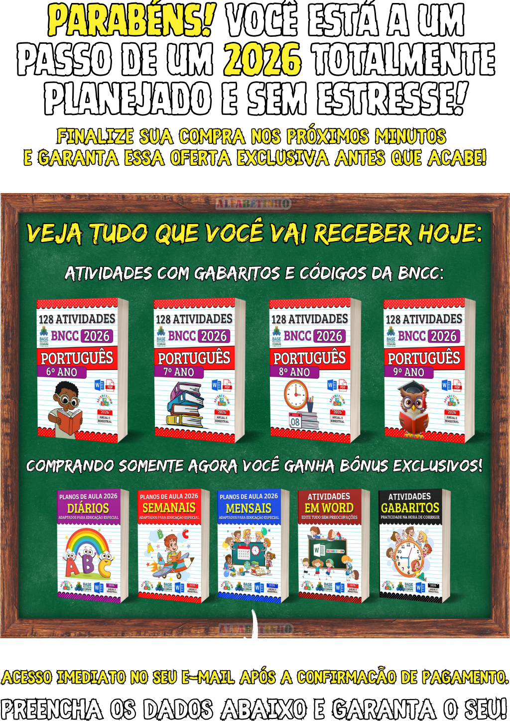 360 Atividades e 180 Planejamentos, todos organizados por Ano e Bimestre, perfeitas para uso imediato. 🎁 GANHE BÔNUS EXCLUSIVOS: 1️⃣ PLANEJAMENTOS EM WORD 2️⃣18 PLANOS DIÁRIOS 3️⃣ ATIVIDADES EM WORD 4️⃣ GABARITOS DAS ATIVIDADES 😱 DESCONTO IMPERDÍVEL, APENAS AGORA!