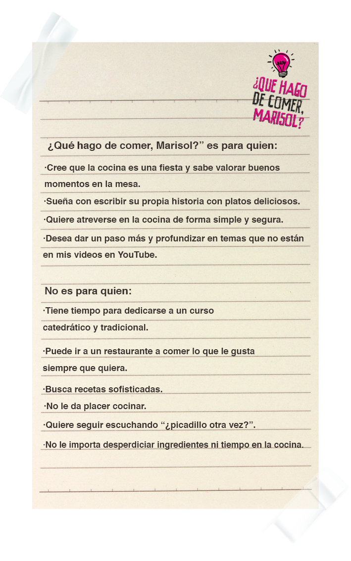 "Cuando descubrí a Marisol Pink supe que no tendría que preocuparme más por mis comidas diarias. Además de ser inspiración laboral en ella encuentro practicidad, sabrosura y un toque de humor a la hora de cocinar"