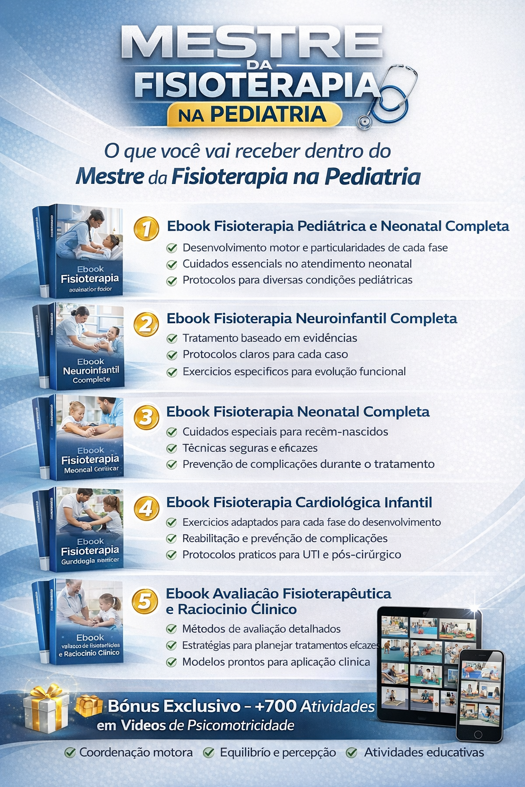 Pensando nisso, criamos o Mestre da Fisioterapia na Pediatria – uma coleção completa com 5 ebooks + bônus exclusivo, elaborada para capacitar você a realizar avaliações precisas, compreender as principais patologias pediátricas e aplicar os tratamentos mais eficazes para cada caso.