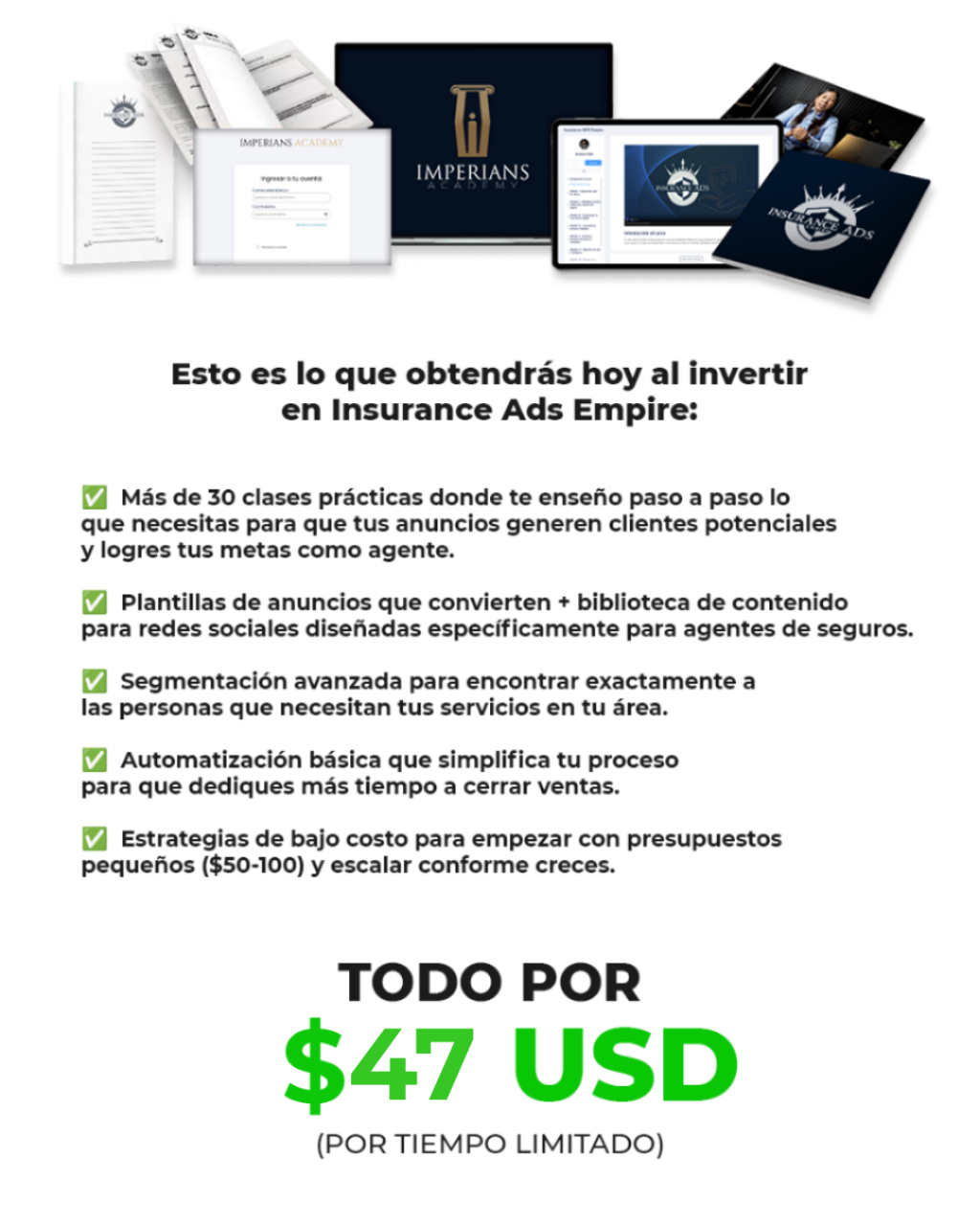 Insurance Ads Empire es el único curso 100 % en español que te enseña a generar clientes potenciales, reclutar equipo y escalar tu negocio como agente de seguros en EE. UU., con Meta Ads, sin depender de agencias, ni gastar miles de dólares. Aprende estrategias probadas, consigue leads diarios y empieza a cerrar más pólizas en menos de una semana.