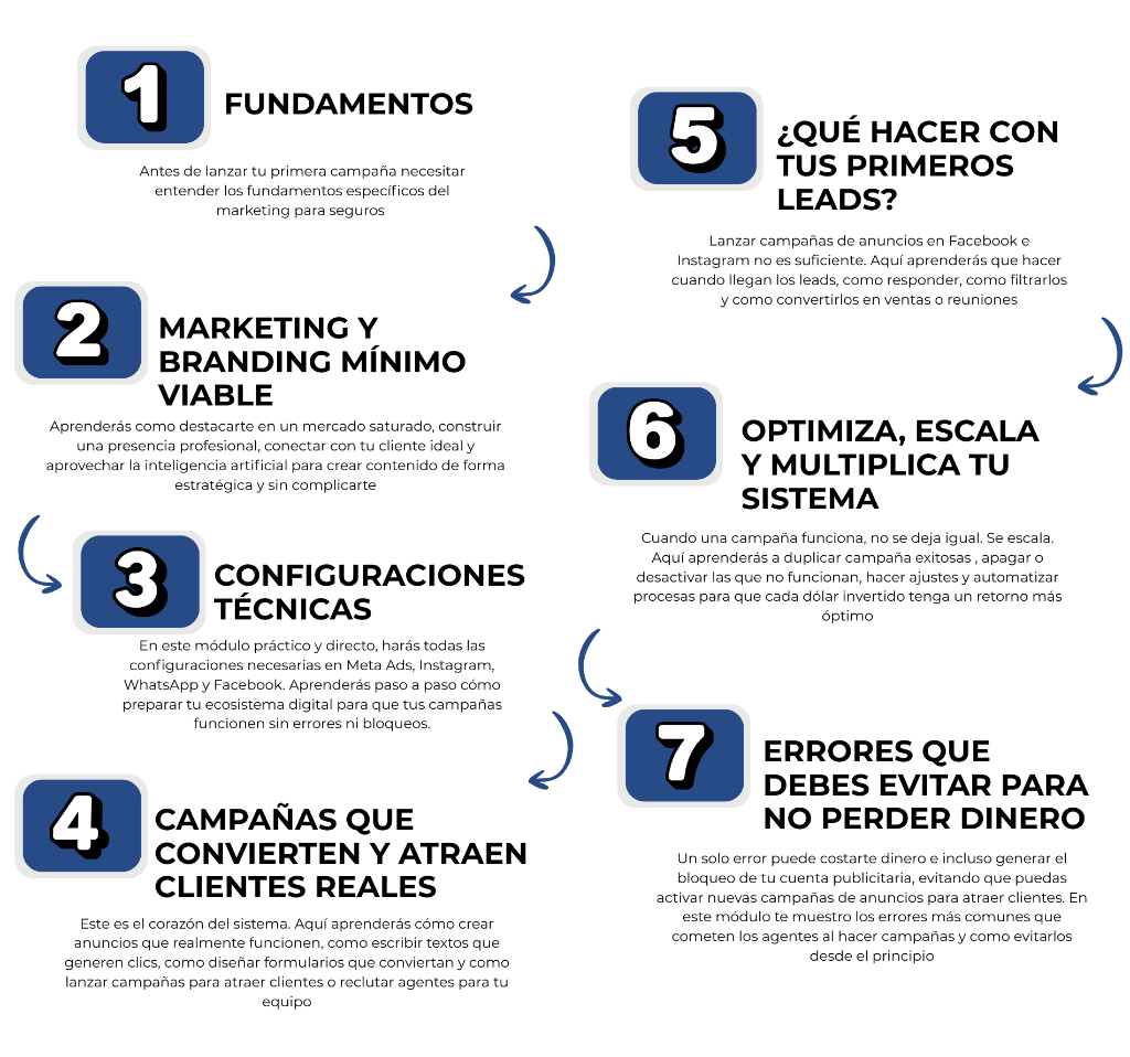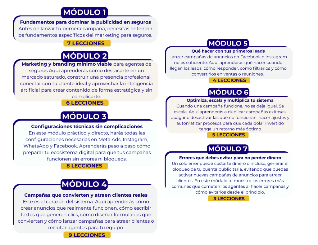 Únete ahora al único curso en español que enseña a agentes de seguros a generar clientes potenciales consistentes y reclutar equipos exitosos con anuncios en Facebook e Instagram en 7 días o menos y recibe: