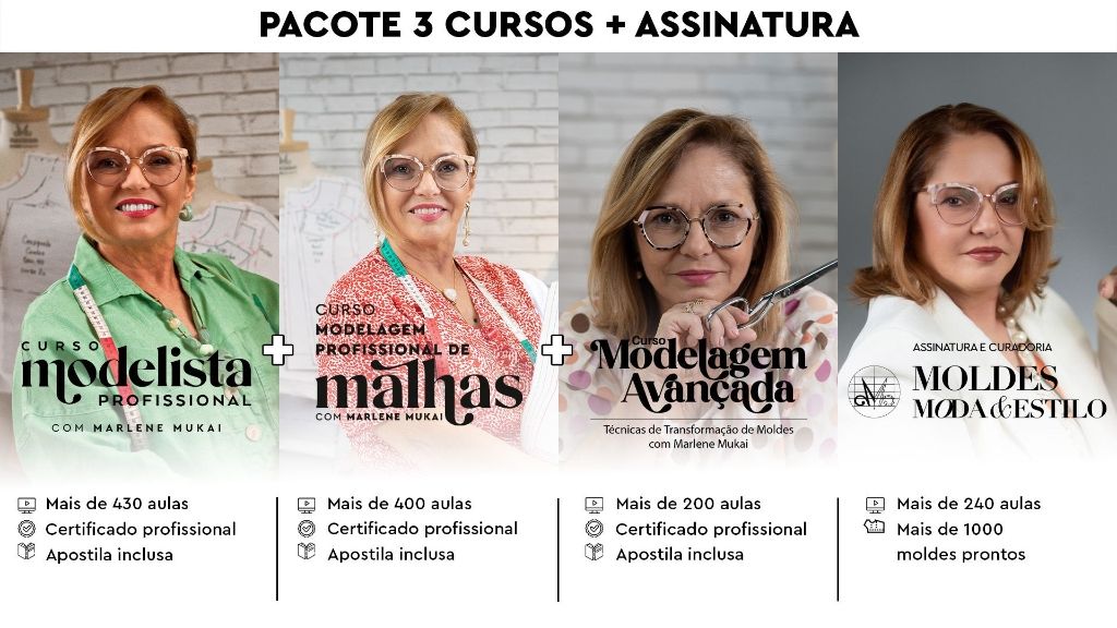 Pacote de 3 Cursos de Modelagem + Assinatura de Moldes por Marlene Mukai