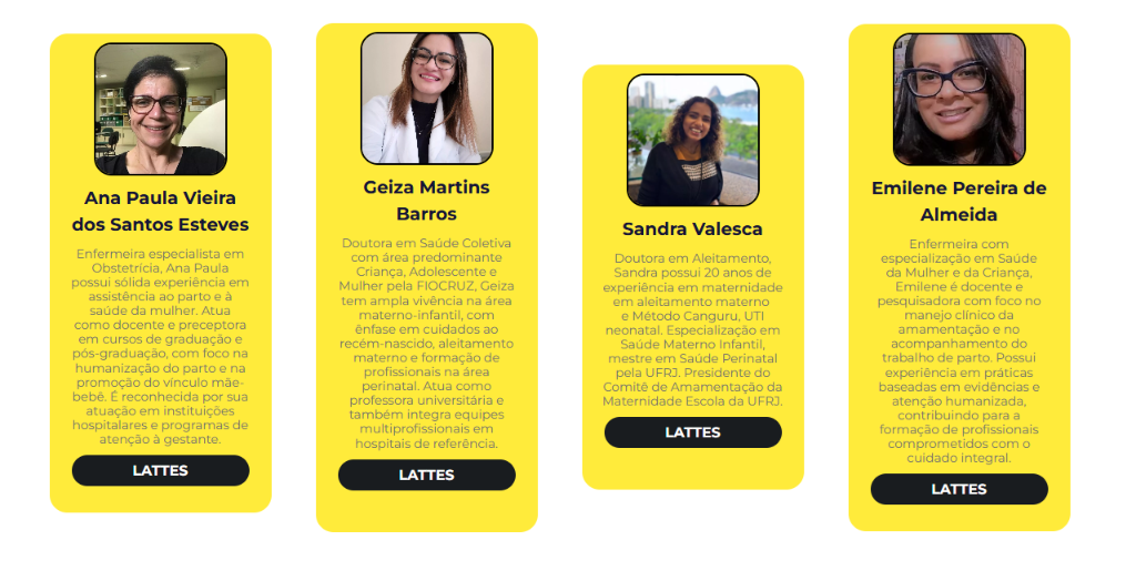 Doutora em Saúde Coletiva com área predominante Criança, Adolescente e Mulher pela FIOCRUZ, Geiza tem ampla vivência na área materno-infantil, com ênfase em cuidados ao recém-nascido, aleitamento materno e formação de profissionais na área perinatal. Atua como professora universitária e também integra equipes multiprofissionais em hospitais de referência.