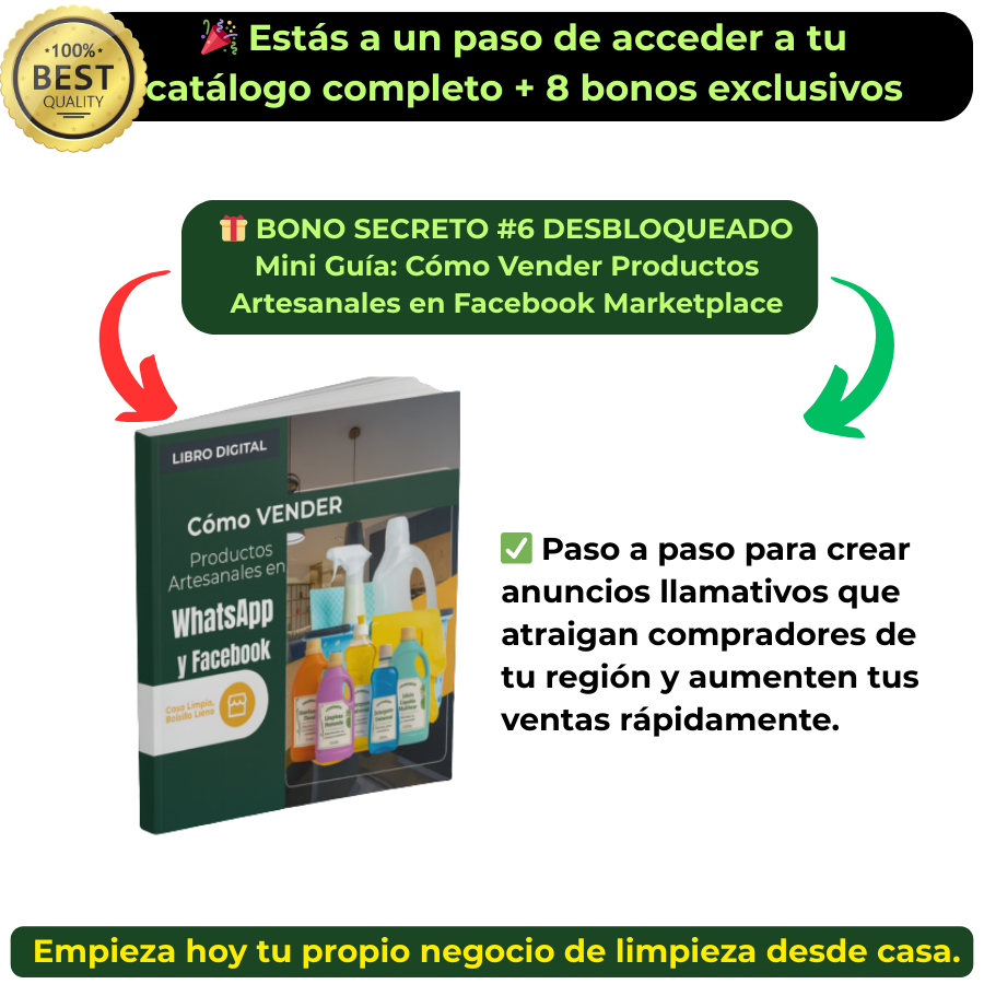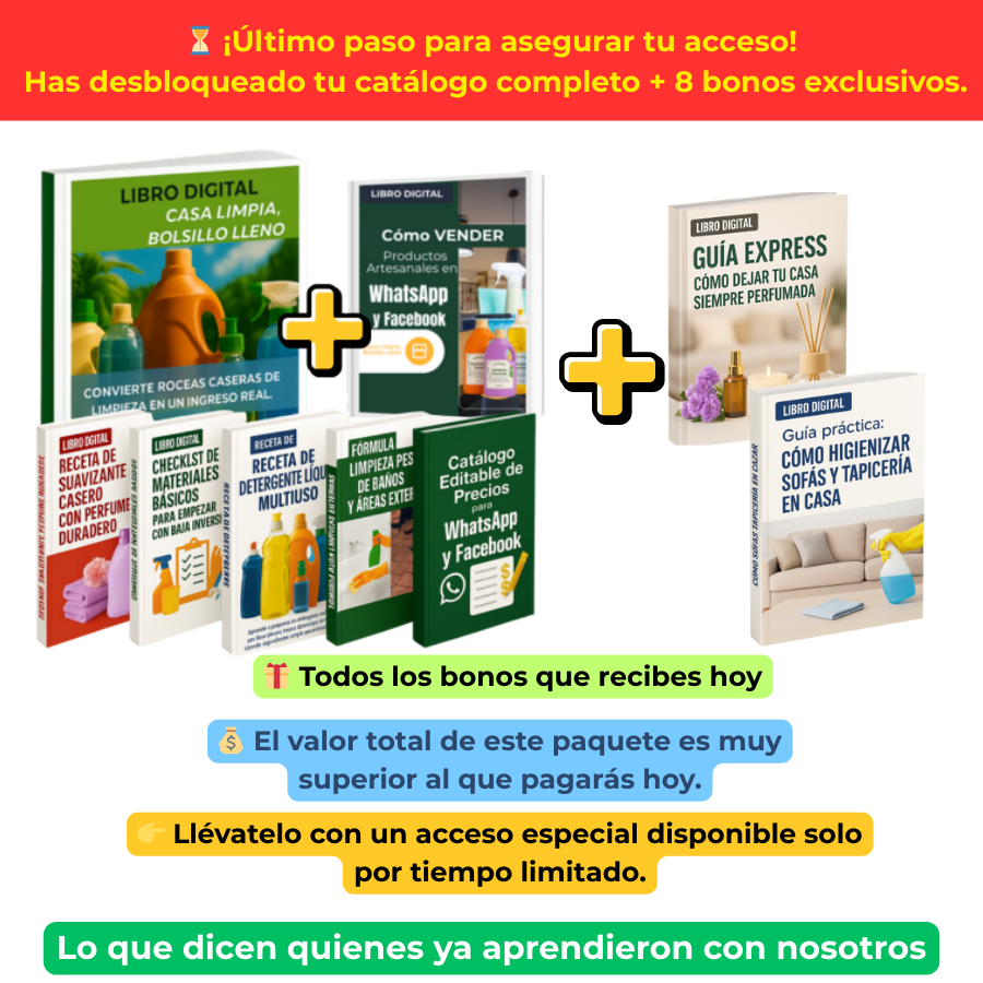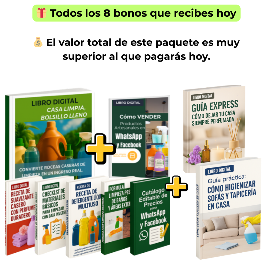Accede a la Guía Digital Casa Limpia, Bolsillo Lleno con precio promocional. Después de hoy, el valor vuelve a la normalidad. ¡Empieza tu negocio rentable de limpieza casera ahora mismo!