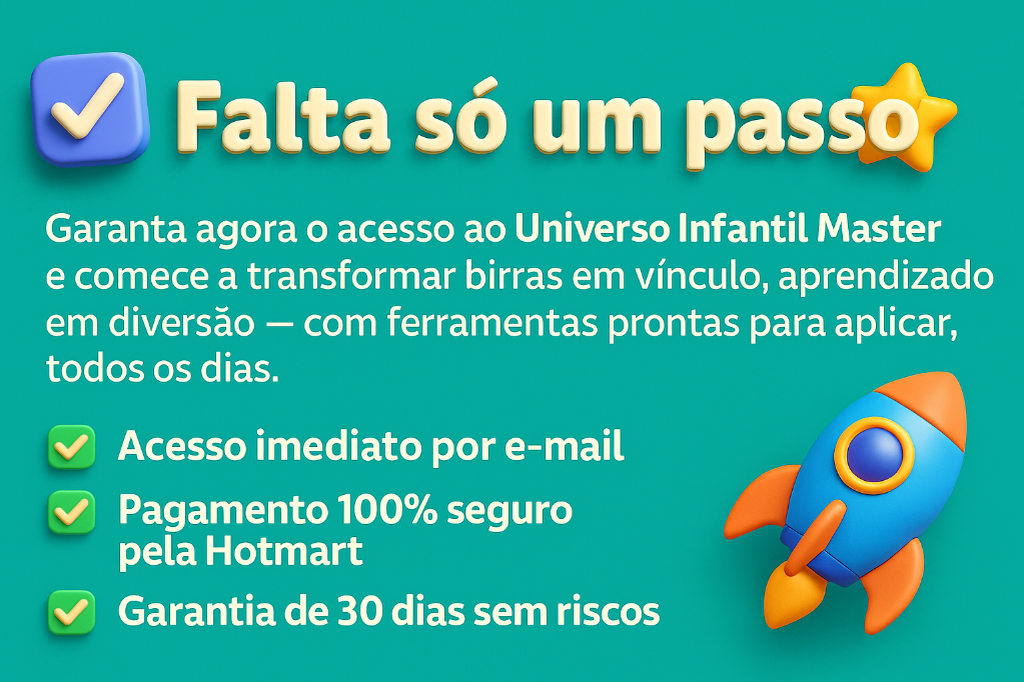 O Manual Secreto da Magia Infantil é um guia digital repleto de atividades simbólicas, brincadeiras encantadas e experiências mágicas para fortalecer o vínculo emocional entre adultos e crianças. Ideal para quem deseja transformar o dia a dia em memórias inesquecíveis, longe das telas e cheias de imaginação.