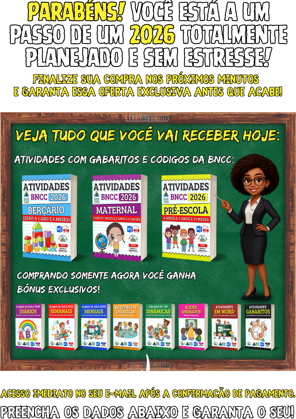 Planejamentos para Berçário, Maternal e Pré-escola, editáveis em WORD, são mais de 200 planos anuais e bimestrais, para todas as disciplinas, todos com os códigos da BNCC 2026. 🎁 GANHE BÔNUS EXCLUSIVOS: 1️⃣ PLANEJAMENTOS EM WORD 2️⃣ 150 PLANOS DIÁRIOS 3️⃣ 105 PLANOS SEMANAIS 4️⃣ 45 PLANOS MENSAIS 5️⃣ 100 SEQUÊNCIA DIDÁTICA 6️⃣ 100 DINÂMICAS 😱 DESCONTO IMPERDÍVEL, APENAS AGORA!