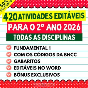 256 Avaliações Bimestrais do 2º ANO, para todas as disciplinas, indicadas para professores que estão procurando avaliações editáveis, prontas para aplicar e com gabaritos. 🎁 GANHE BÔNUS EXCLUSIVOS: 1️⃣ TODAS AS AVALIAÇÕES EM WORD 2️⃣ GABARITOS DAS AVALIAÇÕES 3️⃣ 128 RECUPERAÇÕES EM WORD 😱 DESCONTO IMPERDÍVEL, APENAS AGORA!