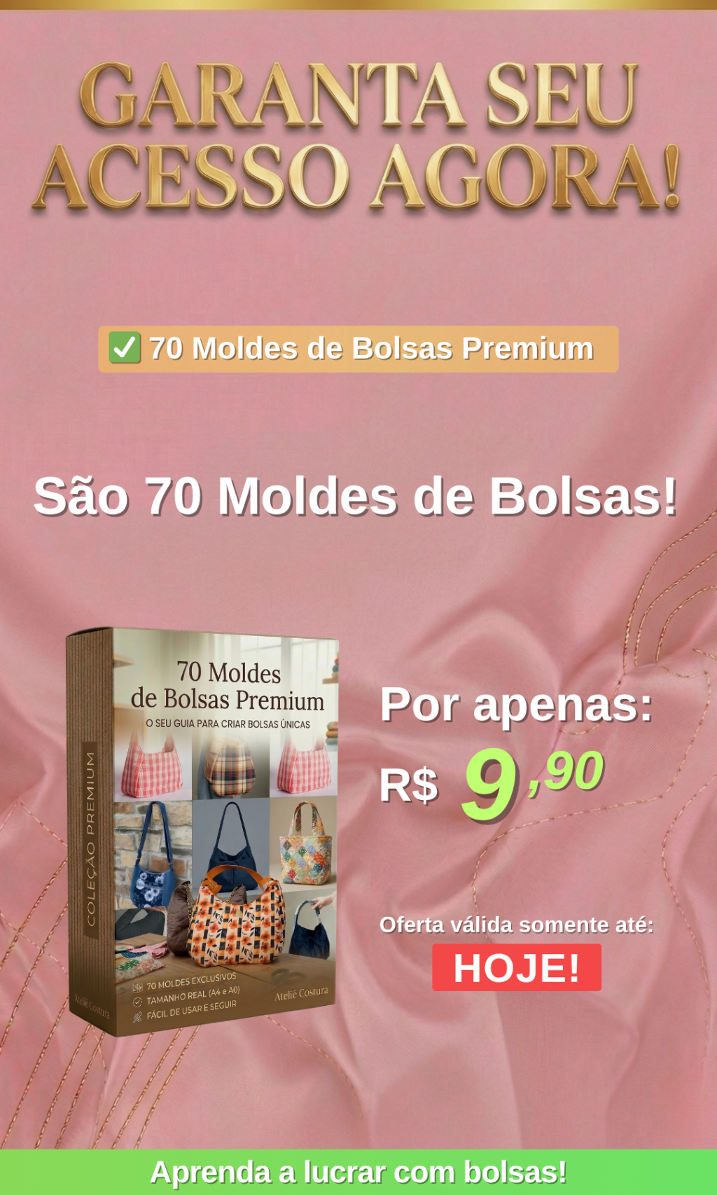 Bolsas vendem o ano todo! Leve 43 moldes exclusivos e fature alto. O pacote inclui modelos de praia, casuais e de passeio. Acessórios têm alta margem de lucro e são fáceis de costurar. Garanta essa promoção por um preço simbólico!