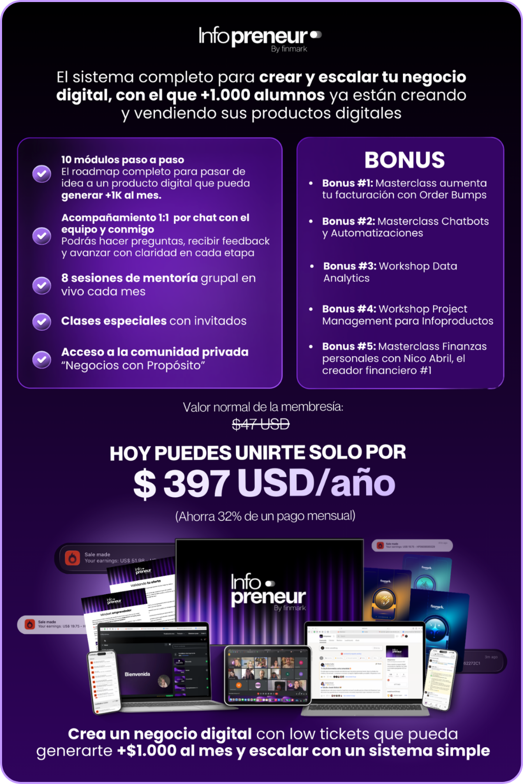 Infopreneur te enseña el sistema, y FunnelsLab lo ejecuta. Aprende detalladamente a construir tu página de ventas en 1 día, con diseño WOW, copy persuasivo y estructura optimizada para vender 24/7, sin experiencia técnica ni grandes inversiones.