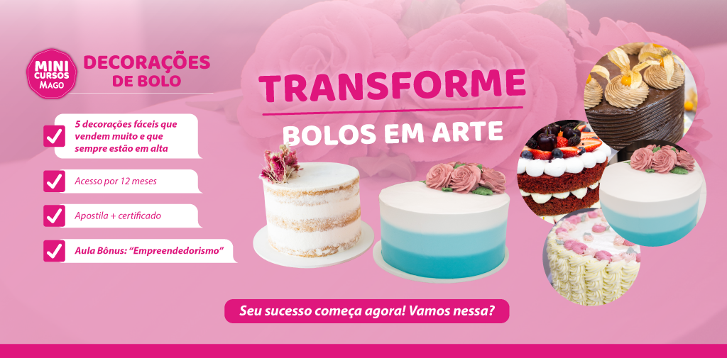 Se você deseja aprender de forma prática e rápida as técnicas de decoração mais tradicionais e quer transformar seus bolos em verdadeiras obras de arte, o Mini Curso Online de Decorações é ideal para você!