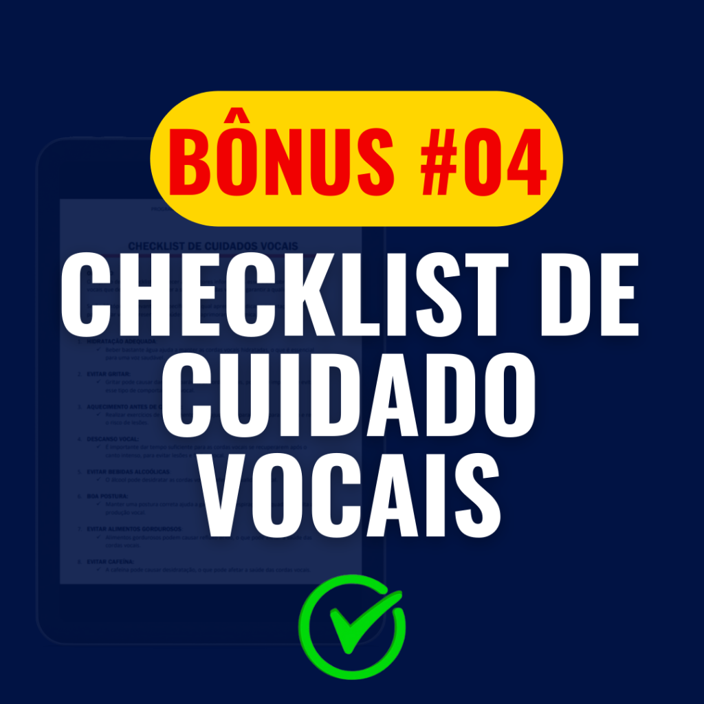Quer ter acesso ao MÉTODO AFINAÇÃO SOB CONTROLE? 😍 ** Você vai compreender como ter uma afinação impecável e sob controle, um verdadeiro autotune natural em sua voz! E de brinde você ainda leva bônus Incríveis: •	#BÔNUS 01 Checklist Diário de Afinação Vocal •	#BÔNUS 02 Descobrindo o Tom Certo Para a Minha Voz •	#BÔNUS 03 Respiração Sob Controle •	#BÔNUS 04 Cantando e Falando com Clareza •	#BÔNUS 05 Alongamento + Aquecimento e Desaquecimento Vocal •	#BÔNUS 06 Audiobook – Como Ter Um Falsete Bonito •	#BÔNUS 07 WorkShop – Sobre Técnica Vocal, (Embelezadores Vocais) VALOR TOTAL: R$1.166,90 mas hoje e somente aqui você pagará apenas R$47,00 Marque agora a caixinha acima, para dominar a afinação vocal e garantir os 7 bônus. OBS: Exercícios Inclusos. **Clique na caixinha para adicionar (Esse produto está disponível separadamente para compra, todavia mais caro!)