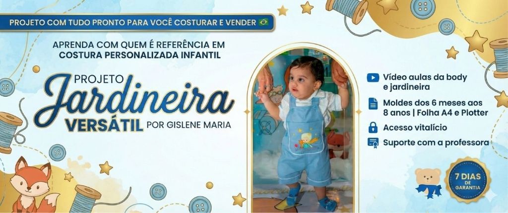 Tenha acesso vitalício ao Projeto Jardineira Versátil com tudo pronto para você costurar e vender mesmo sendo iniciante. (Libere seu acesso agora com mais de 70% de DESCONTO - de R$347 por apenas R$97)
