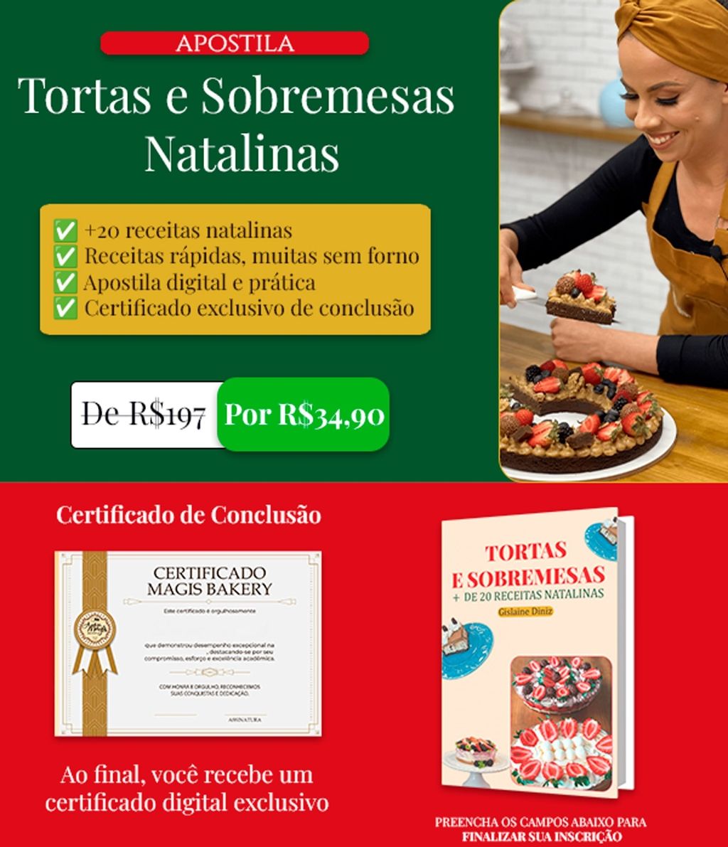 Garanta agora a sua Apostila com +20 Receitas de Tortas e Sobremesas Natalinas e aprenda sobremesas práticas, recheios fáceis e técnicas para encantar clientes e familiares neste Natal. Acesso imediato à apostila em PDF + certificado digital