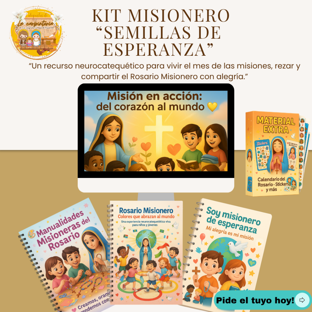 🌸 Añade este complemento perfecto al KIT MISIONERO 🕊️ ¡Octubre es también el mes del amor a Mamita María! Haz que la experiencia sea aún más completa con este hermoso recurso adicional: 📚 Set de Mini-Ebooks Marianos para Niño: ✅ Fortalece el vínculo afectivo con María ✅ Enriquece momentos de oración o lectura en familia ✅ Añade valor a tu catequesis con historias que los niños aman 🎁 Oferta exclusiva solo al adquirir el KIT MISIONERO