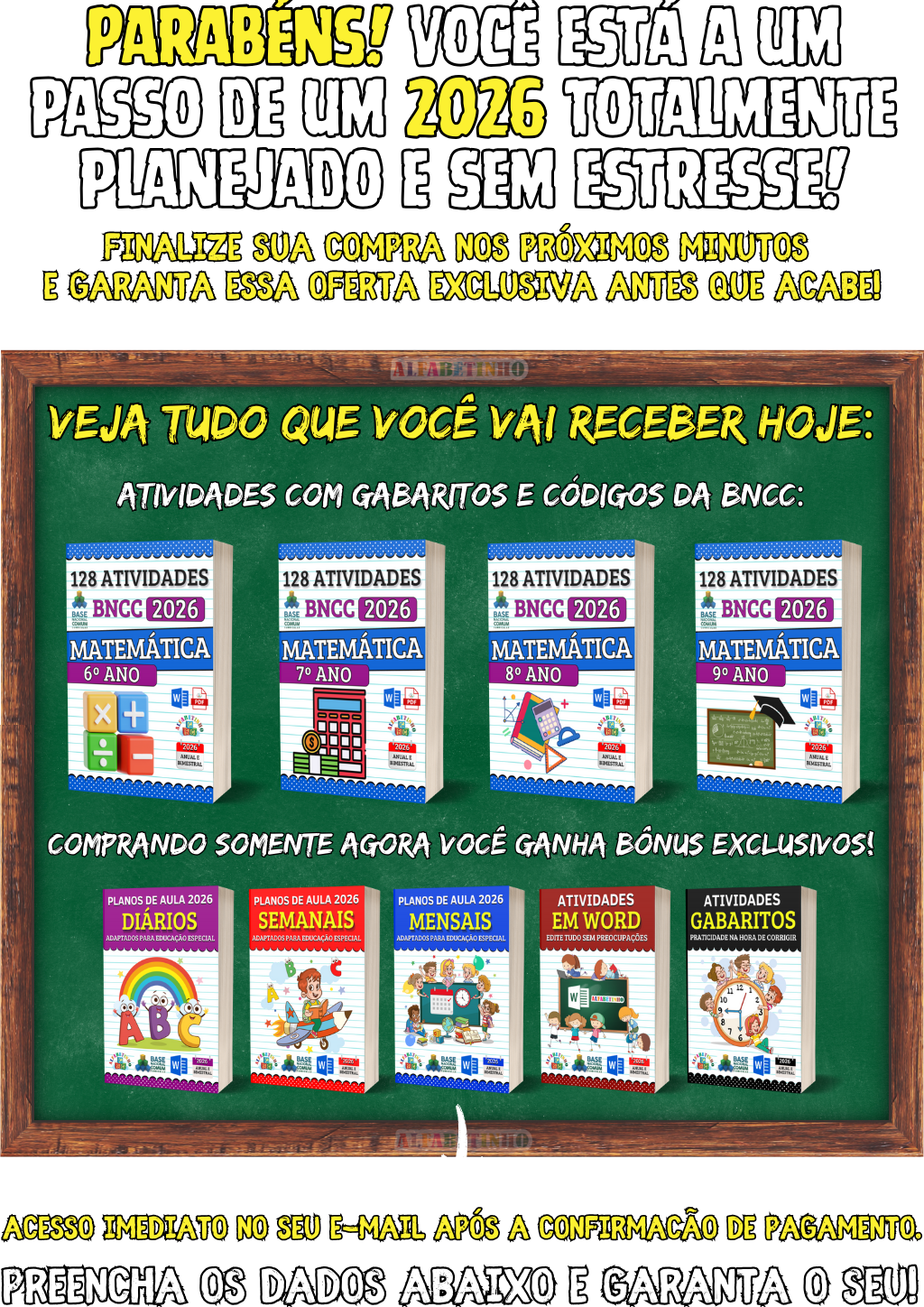360 Atividades e 150 Planejamentos, todos organizados por Ano e Bimestre,perfeitas para uso imediato. 🎁 GANHE BÔNUS EXCLUSIVOS: 1️⃣ PLANEJAMENTOS EM WORD 2️⃣18 PLANOS DIÁRIOS 3️⃣ ATIVIDADES EM WORD 4️⃣ GABARITOS DAS ATIVIDADES 😱 DESCONTO IMPERDÍVEL, APENAS AGORA!