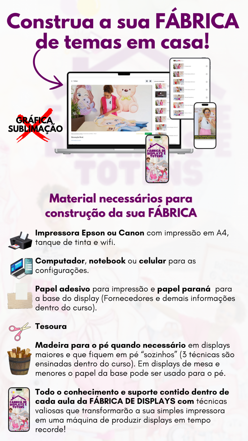🔐 Tenha acesso exclusivo a um módulo secreto da Fábrica e aprenda, passo a passo, como montar uma festa completa usando apenas displays impressos com em folhas tamanho A4. Descubra técnicas de balões, projeto digital, piso de lona branca, organização dos painéis criativos e muito mais. Inspire-se com bastidores reais e saia com ideias prontas para aplicar imediatamente nas suas próprias decorações 🎉