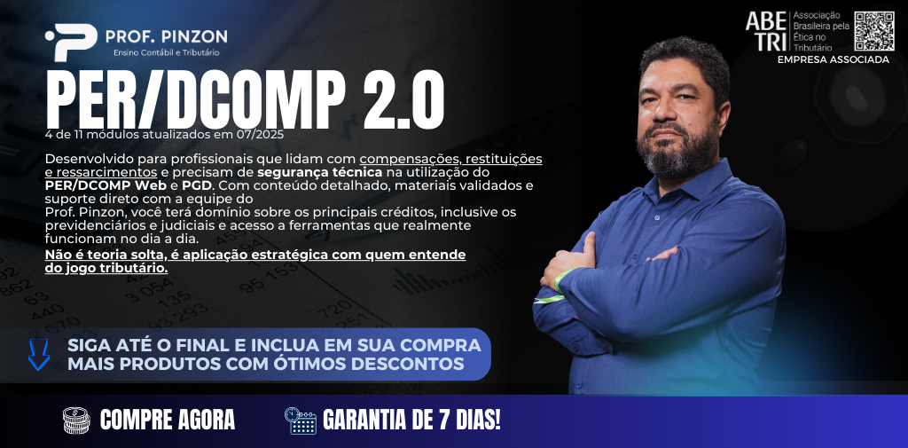 Torne-se EXPERT em PER/DCOMP! 8 espécies de crédito, 9h40min em vídeo, 186 slides, 7 planilhas - incluindo a de atualização e compensação de ação judicial. Parcelamento no cartão em até 12 vezes.