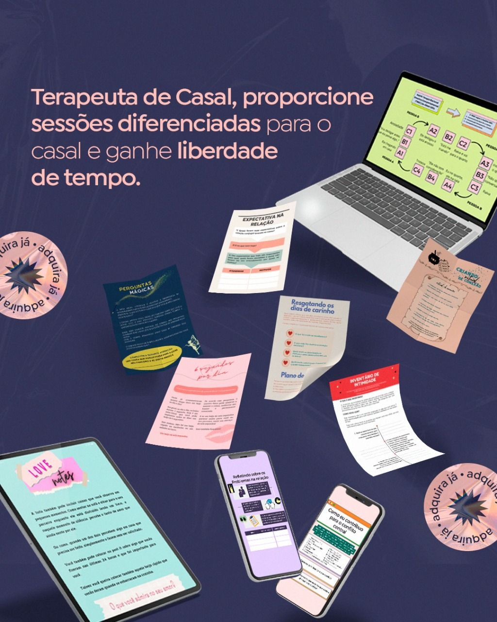 Por apenas R$47,00 você leva o e-book INTERVERÇÕES CRIATIVAS NA TERAPIA DE CASAL completo para ajudar psicólogos que trabalham com casal a inovarem na sua prática clínica. Você vai encontrar intervenções e o passo a passo para aplicá-las para as seguintes demandas no relacionamento amoroso: - Autoconhecimento; - Ansiedade; - Trabalho em Equipe; - Comunicação não Violenta; - Repetições Familiares; - Desenvolvimento Profissional Feminino; - O Casal na fase do ninho vazio; - Separação e Divórcio.