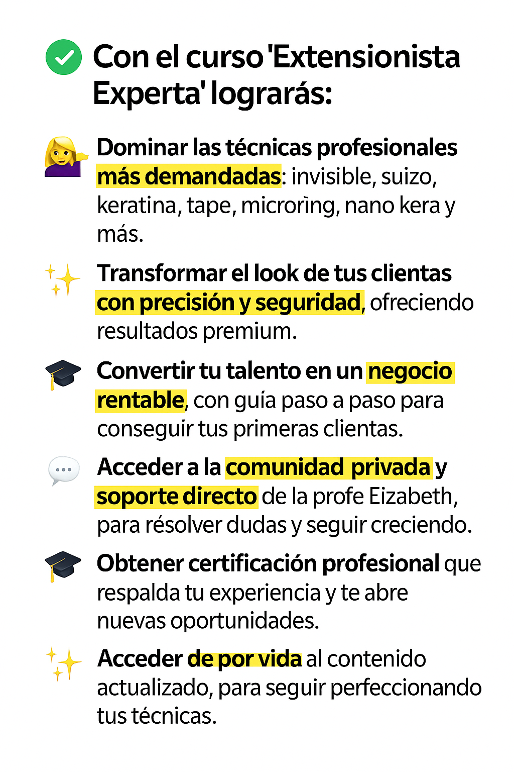 En este programa, aprenderás las técnicas esenciales para garantizar que las extensiones de tus clientes permanezcan impecables y radiantes. Desde el arte del lavado adecuado hasta la frecuencia ideal, te proporcionaremos las herramientas necesarias para destacar en el cuidado de extensiones. Precio Regular USD 40 hoy USD 19.99