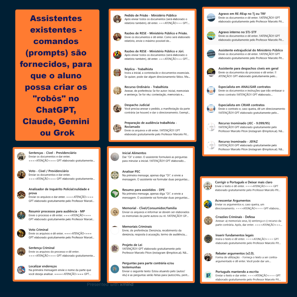 O acesso normal é de 01 ano, mas você pode se tornar um aluno vitalício agora. Essa oferta não será feita em outro momento. - BÔNUS EXCLUSIVO: Acesso vitalício ao livro "Inteligência Artificial para Profissionais do Direito". Receba sempre a última versão atualizada! - Acesso Vitalício aos Prompts e Robôs: Você sempre terá os prompts que forem sendo criados pelo Professor Marcelo, podendo utilizá-los no ChatGPT, Claude, Gemini e Grok. - Acesso a todas as atualizações: o curso é SEMPRE atual.