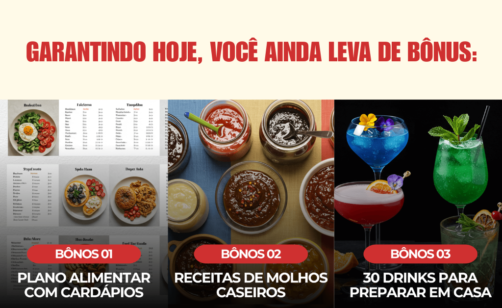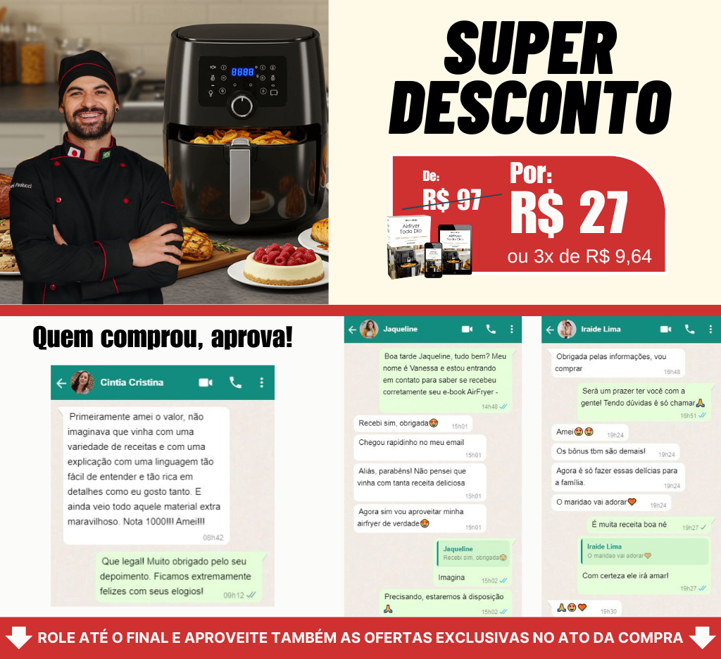 Aqui você leva os 3 produtos acima com um preço nunca visto antes!! No combo você vai ter a acesso além das 200 Receitas para AirFryer: - BOLOS DE LIQUIDIFICADOR - RECEITAS DE CALDOS E SOPAS - 50 PETISCOS SAUDÁVEIS PARA AIRFRYER Tudo isso Por apenas R$27 *Ao sair dessa página você perde a oportunidade de adquirir tudo isso com essa MEGA DESCONTO!*