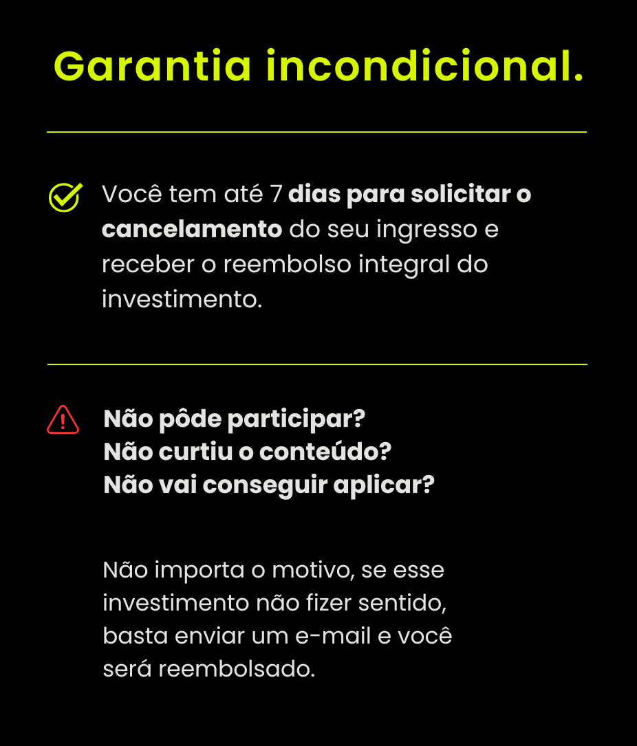 Disponível por 7 dias após o evento Para quem quer garantir que vai aplicar — e não só assistir. ✓ Acesso à gravação completa do evento ✓ Slides apresentados durante a aula ✓ Planner Best-Seller para executar o plano passo a passo ✓ Seu investimento vira cashback.