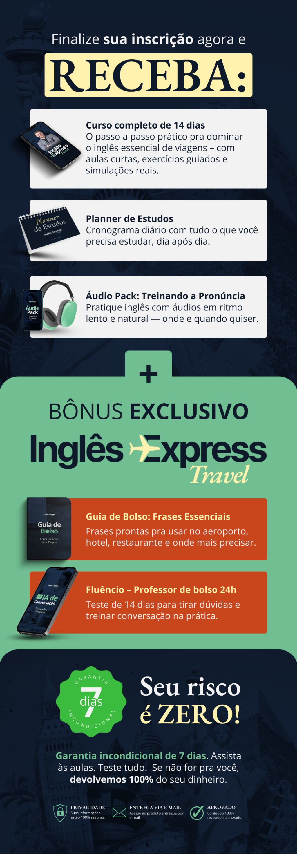 Você não precisa ser fluente para falar inglês! Neste curso completo com aulas gravadas, você vai aprender o essencial para: ✅ Cumprimentar pessoas. ✅ Perguntar ou dizer como você está. ✅ Perguntar ou responder perguntas sobre trabalho. ✅ Falar ou perguntar sobre hobbies. ✅ Falar ou perguntar de onde você ou outra pessoa é. ✅ Pedir o contato de alguém ou dizer o seu contato. ✅ Pedir informações. Sem ter que esperar meses até ficar fluente.