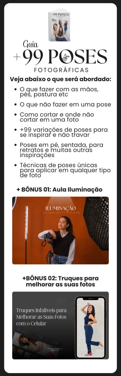 Adicione agora o Guia de Poses em Vídeo e veja as técnicas acontecendo na prática, com explicações mais detalhadas para você entender como fazer poses com o seu corpo da cabeça aos pés e nunca mais travar diante da câmera. OFERTA EXCLUSIVA DESSA PÁGINA. Você não terá acesso a essa condição especial novamente após finalizar a compra.