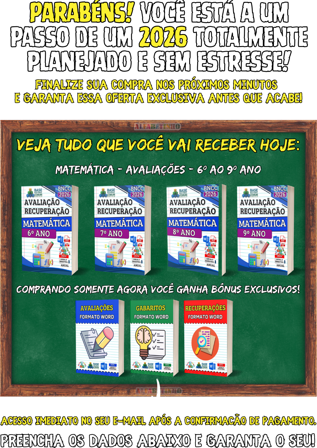 512 Atividades e 480 Planejamentos, todos organizados por Ano e Bimestre, de acordo com a BNCC 2026. perfeitas para uso imediato. 🎁 GANHE BÔNUS EXCLUSIVOS: 1️⃣ PLANEJAMENTOS EM WORD 2️⃣ ATIVIDADES EM WORD 3️⃣ GABARITOS DAS ATIVIDADES 4️⃣ 32 PLANOS DIÁRIOS 5️⃣ 24 PLANOS SEMANAIS 6️⃣ 16 PLANOS MENSAIS 😱 DESCONTO IMPERDÍVEL, APENAS AGORA!