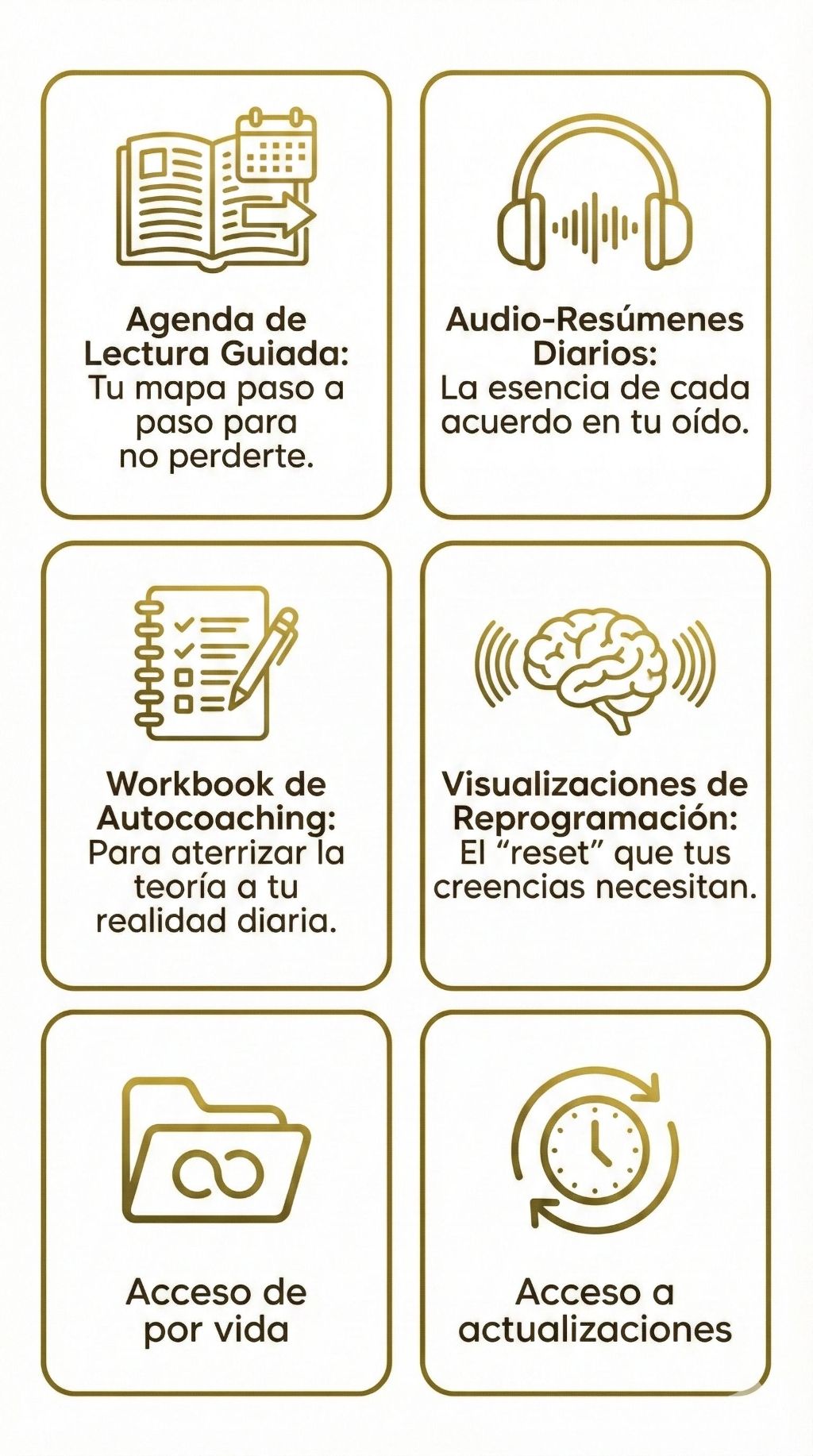 Si vas a limpiar tu mente de acuerdos limitantes, ¿por qué no instalar las leyes que gobiernan la abundancia real? Con este reto de 7 días basado en la sabiduría de Deepak Chopra, aprenderás a dejar de "luchar" por tus metas y empezarás a fluir con ellas. Incluye: Guía de aplicación diaria + Audios de consciencia + Ejercicios de ingeniería espiritual. Añádelo ahora y completa tu kit de reinvención por el precio de un café.