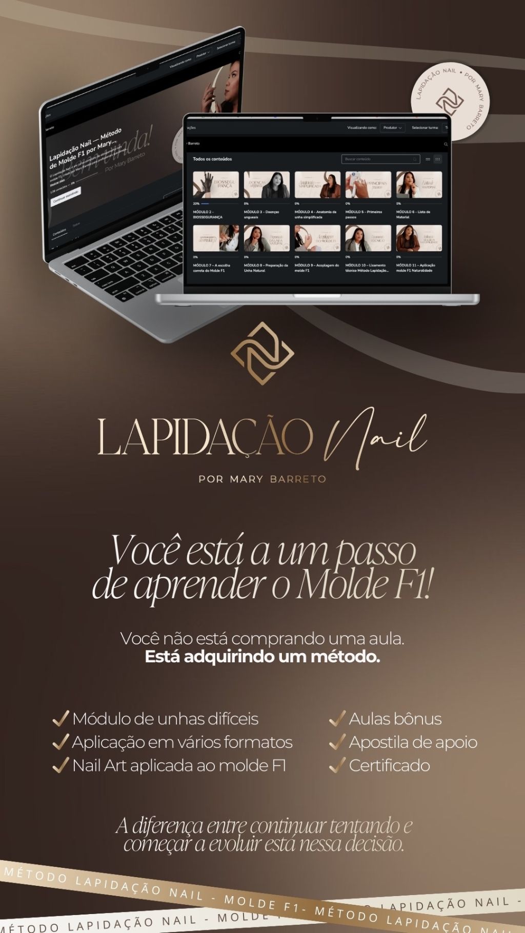 Um método completo para aprender o Molde F1 com estrutura, naturalidade e acabamento profissional. Mais de 50 aulas práticas, organizadas do início ao avançado, incluindo escolha correta do molde, preparação da unha natural, acoplagem, lixamento técnico,