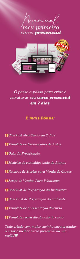 Tenha acesso ao Plano de 21 dias de Postagens para atrair alunas todas os dias ✅Mais de 150 roteiros de conteúdos validados. ✅150 Templates de Postagens para Atração de Alunas. ✅Plano de 21 dias com um calendário para você se planejar e executar todos os meses do ano. ✅Roteiros e Narrativas para gerar desejo e vender pelos Stories IMPORTANTE!!: VOCÊ NÃO VERÁ ESTA OFERTA EM OUTRO LUGAR