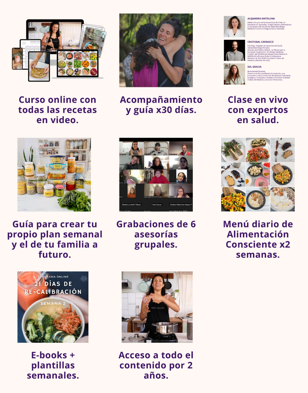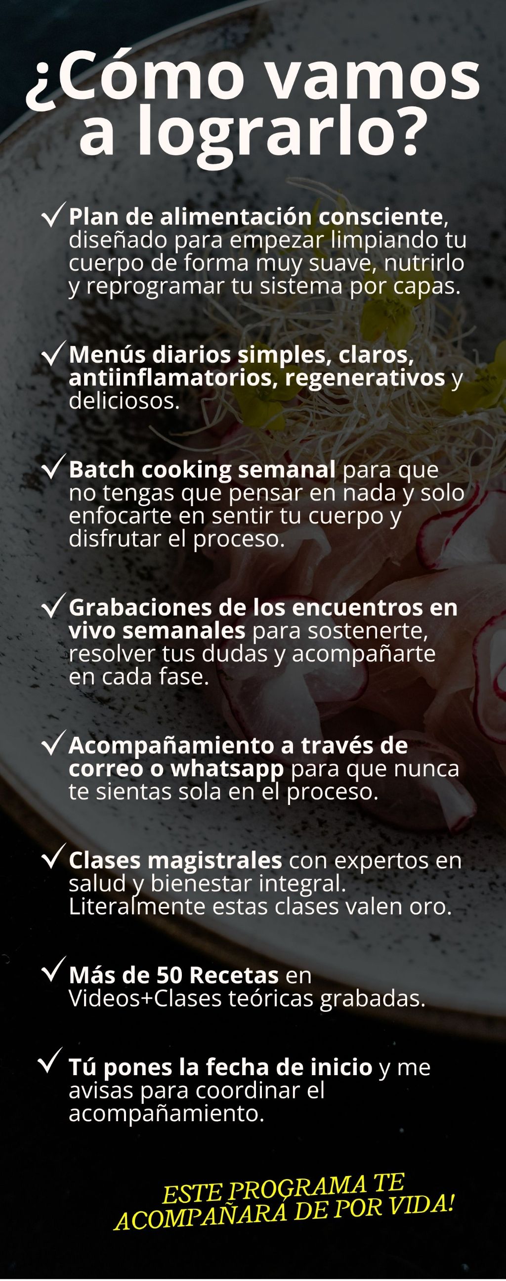 Durante tres semanas te iré acompañando por correo o vía WhatsApp y compartiremos clases, menús, herramientas y recetas para transformar tu cocina y tu cuerpo. Todo el contenido queda grabado y disponible durante 2 años.