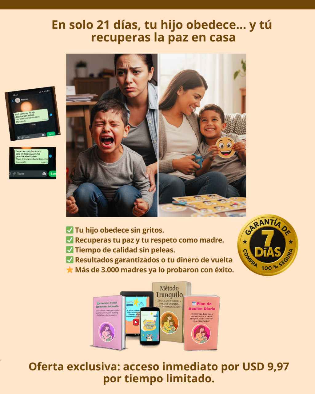 "Hoy empecé a aplicar el método y ya sentí paz. Mi hijo me abrazó de repente 😭. Es tan simple y ya transformó nuestro día. ¡Vale cada centavo!"