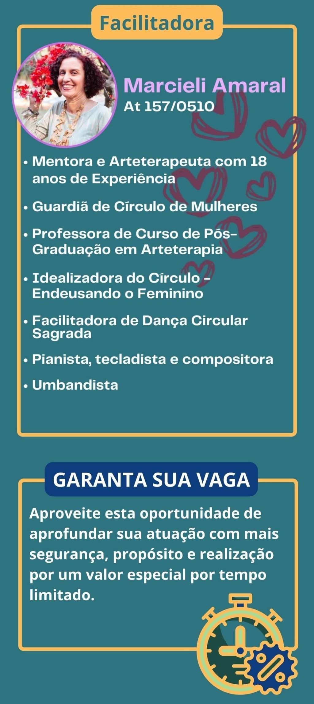 Desperte o poder do feminino em suas clientes! 🌸Curso teórico e vivencial, feito para terapeutas, arteterapeutas e facilitadoras de Círculos de Mulheres. Vamos explorar o poder das Deusas Gregas — Héstia, Atená, Ártemis, Deméter, Hera, Perséfone e Afrodite para apoiar o empoderamento feminino e o autoconhecimento. No curso, utilizaremos ferramentas como: •Arteterapia, •Danças Circulares Sagradas, •Meditação, •Rituais, •Cantos, •Oráculos. São 8 superaulas totalizando 12,5 horas.