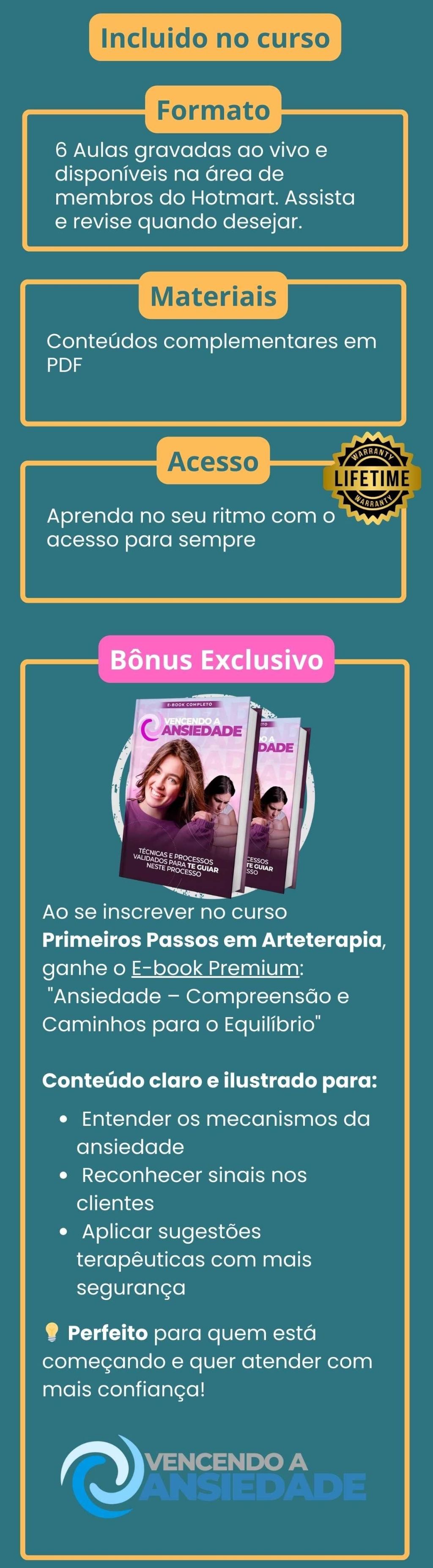 ✨Descubra como iniciar seus atendimentos em Arteterapia com segurança, criatividade e propósito. Neste curso, você aprenderá técnicas práticas, estratégias de vínculo e atividades que fortalecem sua atuação e proporcionam transformações desde os primeiros encontros. Ideal para quem está começando ou deseja estruturar melhor sua prática terapêutica! 3 SUPERAULAS que acompanham materiais complementares para o aproveitamento máximo e experiência na prática!