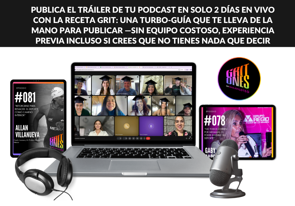 PUBLICA el tráiler de tu podcast en solo 2 días en vivo con la Receta GRIT: una turbo-guía que te lleva de la mano para publicar —sin equipo costoso, experiencia previa ni perder meses en investigación técnica.