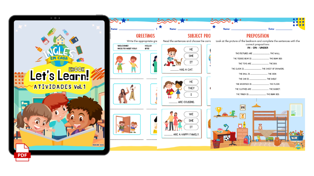 order bump inglês divertido eBook com 35 páginas e atividades de diversos temas, como: greetings, body parts, places in the city, jobs, feelings, pronouns, verb to be, the time, etc. A criança vai poder praticar vários temas em um único eBook, com atividades incríveis! Indicado para crianças de 6 a 10 anos. E vem com um jogo de tabuleiro para a criança praticar os verbos, e um PDF com as respostas. E todas as atividades possuem tradução e áudio.