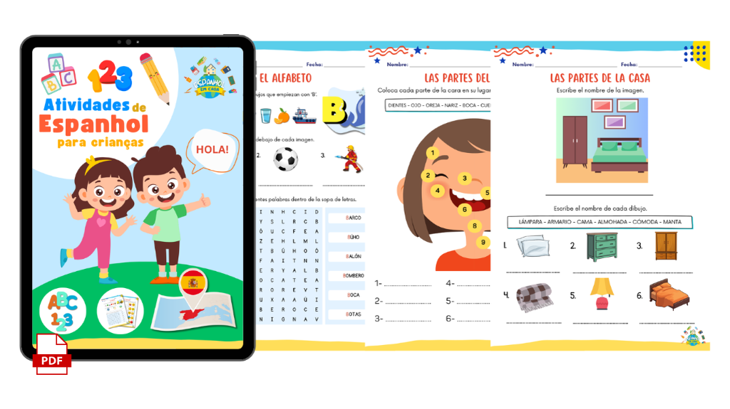 eBook com 126 atividades de Espanhol – indicado para crianças de 6 a 10 anos. Desperte o interesse das crianças pelo espanhol com atividades educativas e envolventes! Você encontra neste material 15 temas com atividades variadas: alfabeto, números, roupas, alimentos, animais, partes do corpo, escola, cores, e muito mais! Com PDF de respostas, tradução e áudio!