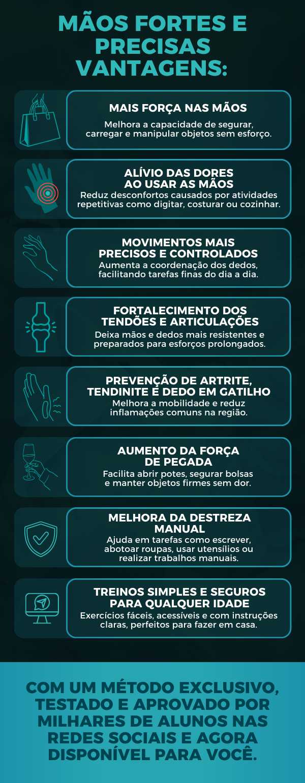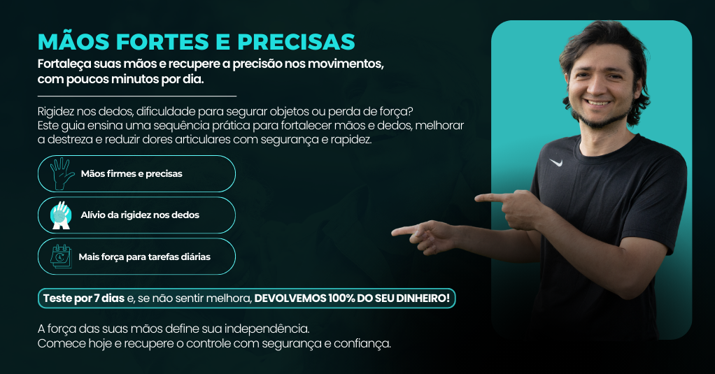 Ebook “Mão Forte e Precisa” - Fortaleça suas mãos e recupere a precisão nos movimentos — com poucos minutos por dia.
