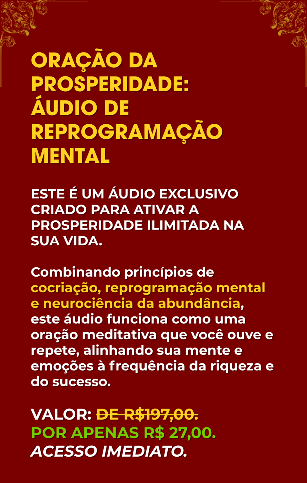 Um áudio profundo de visualização guiada para: encerrar energeticamente o ciclo antigo, ativar uma nova frequência emocional, visualizar e sentir a vida que você quer viver, evitar que sua mente volte para o padrão antigo. Você não só imagina, você ancora.