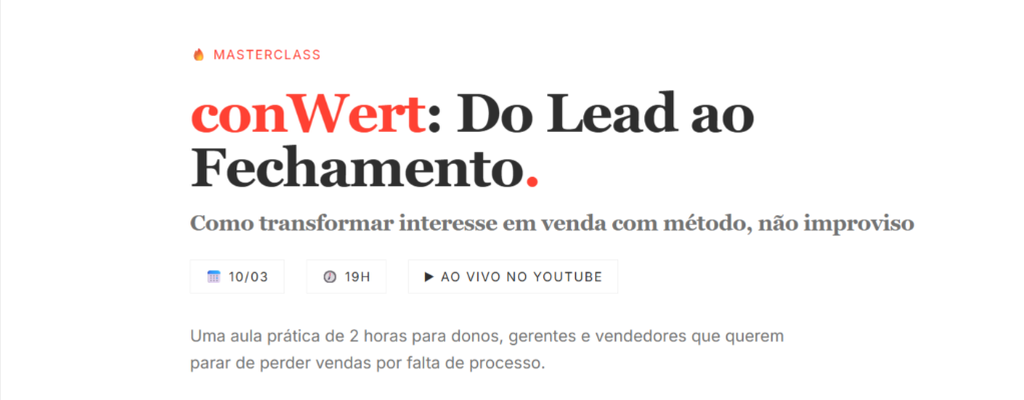 Oferta válida somente neste momento. Tenha acesso por 12 meses à Gravação da masterclass conWert de vendas, para rever os aprendizados e treinar toda sua equipe. Uma aula 100% prática de 2 horas para donos, gerentes e vendedores que querem parar de perder vendas por falta de processo.